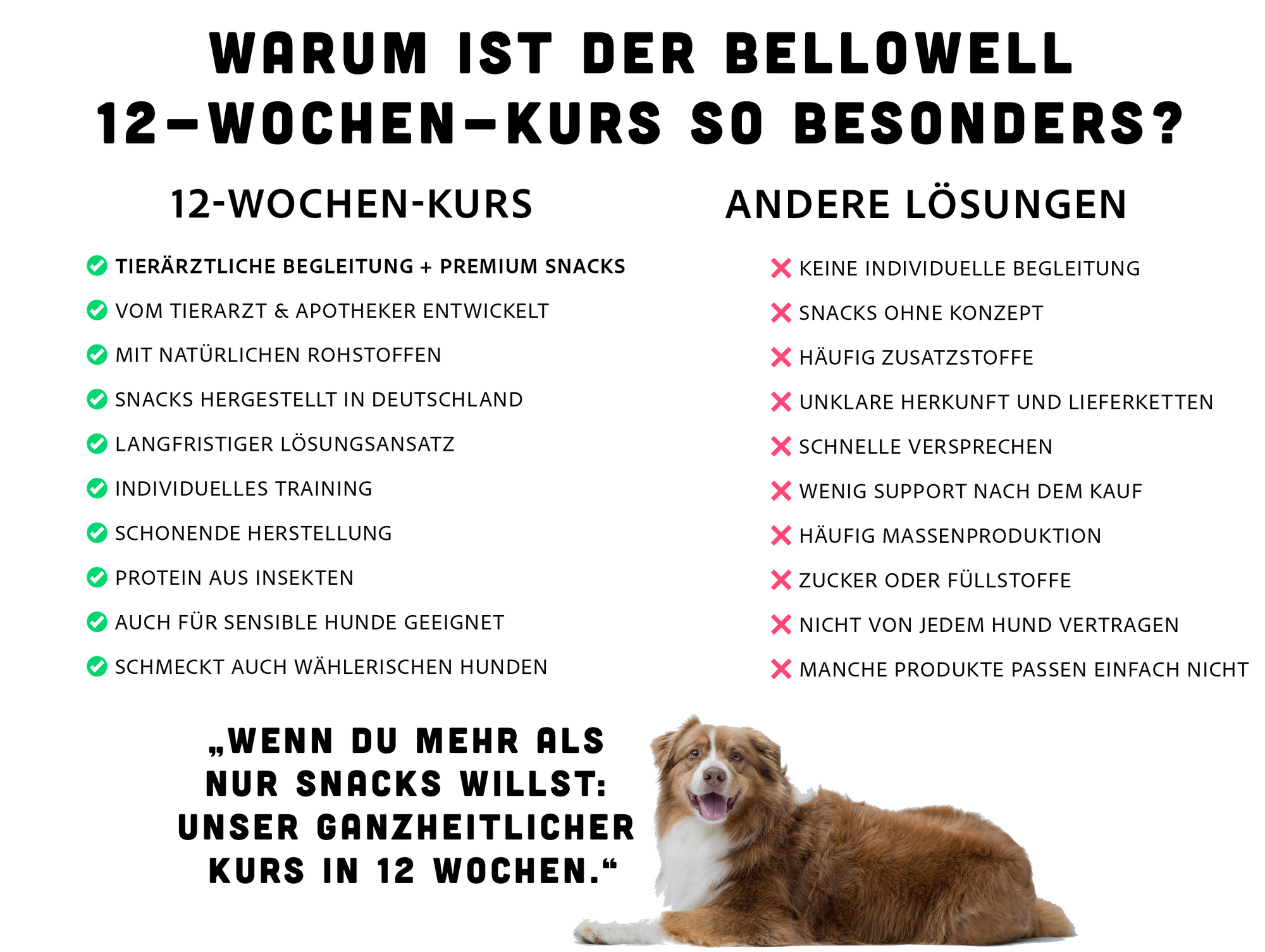 Das Herzstück unseres 12-Wochen-Entspannungs-Kurses ist die individuelle Begleitung von dir und deinem Hund. Mit drei Fragebögen – zu Beginn, in Woche 4 und in Woche 8 – passen wir unsere Empfehlungen gezielt an eure Bedürfnisse und Gewohnheiten an. Außerdem erhältst du im BELLO CLUB – unserer Lernplattform – Videos vom Tierarzt & Apotheker, abgestimmt auf das konkrete Problem deines Hundes.