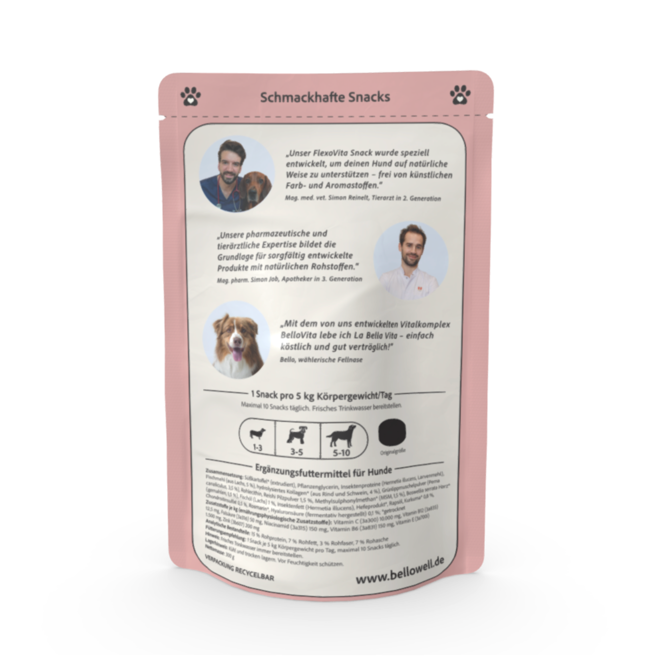 Unser BelloWell Flexovita Snack ist ein hochwertiges Ergänzungsfuttermittel, das ausgewählte tierische und pflanzliche Zutaten mit wichtigen Vitaminen und Spurenelementen kombiniert.